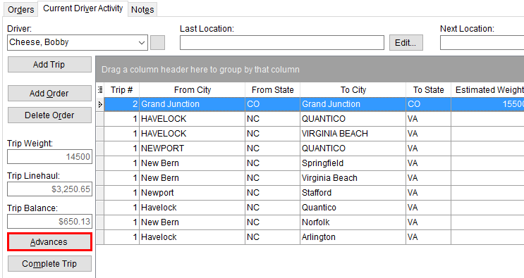The Advance Management screen is available through the Advances button wihtin the Current Driver Activity tab in Long Distance Dispatch.