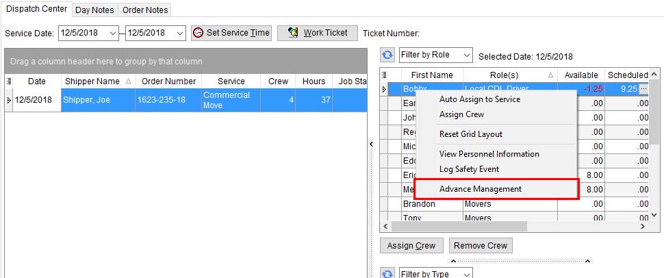 It is also available through the Advances option from the right-click menu on the Current Driver Activity tab as well and from the Advance Management option within the right-click menu from the Dispatch Center in Local Dispatch.