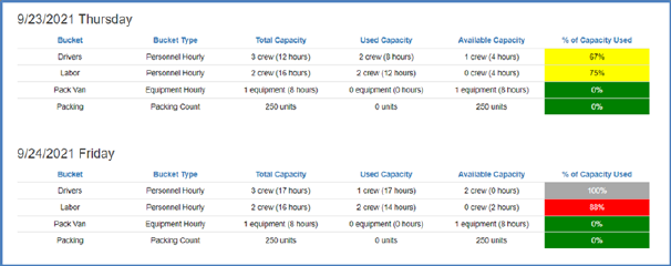 In Capacity Planning, there are individual buckets for each asset (personnel, equipment/hourly and counts) and one for each individual day for each asset. So, a Bucket is the term we use to describe an asset that has availability and use. It starts with a bucket created in MoversSuite Administration > Operations > Capacity Bucket. See Capacity Settings.