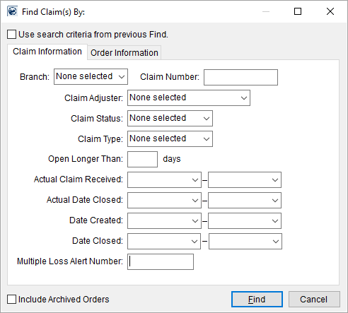 The following table describes the data fields referenced within Claim Information tab of a Find. Refer to Find the topic for information on the functions available through this dialog.