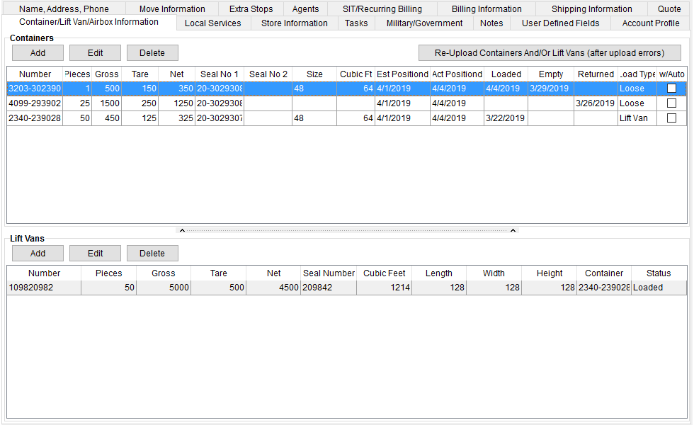 Use the Add, Edit, and Delete buttons within each section to manage the data. Refer to Add Container and to Add Lift Van for field descriptions and usage. NOTE: Add, Edit, and Delete are disabled if the order is in Edit mode.