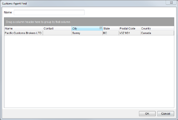 The Customs Agent Find allows a user to quickly locate and set a carrier field by Name within the Shipping Information tab (available through the find icon () associated to the Customs Agent field).