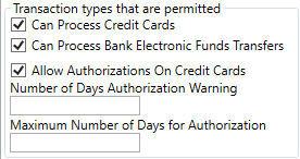 If Allow Authorizations On Credit Cards is checked, then the following fields can be set: Enter a number for the Number of Days Authorization Warning. This provides a warning within ___________ that the aging date of the authorization is the number of days set in this field. This can be left blank. The Maximum Number of Days for Authorization is set to determine the number of days that can pass between the initial authorization and the day the authorization is processed in a completed credit card charge. If the authorization is not completed (charge) by the deadline, it must be voided.