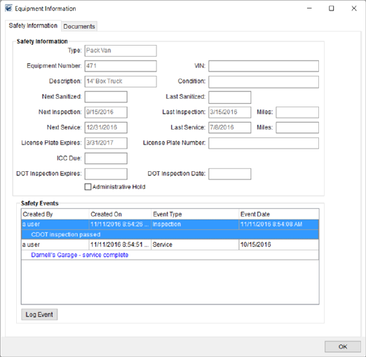 This screen features the Safety Information (Equipment) tab along with ability to view Equipment Documents through the Documents (Equipment) tab. Documents that have their Inactive box checked by Administration will not be shown.