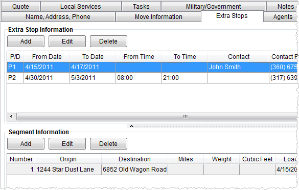 Segments define a sequential relationship between move locations.  A segment can be set up that identifies the route a driver would take from an origin address to an extra stop and another to a final destination, or a segment can be defined that bypasses all extra stops, for example.  Segments can be set up in any way that fits a moving company needs.