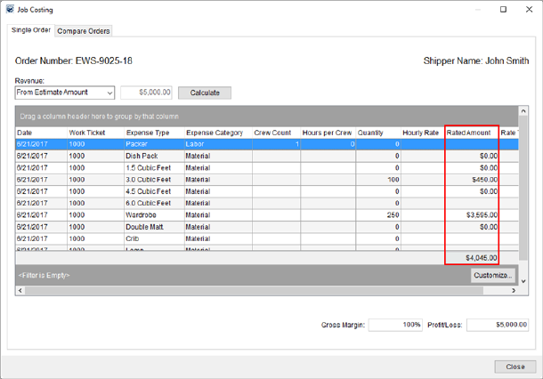 MoversSuite takes costing data assigned to an order through containers, personnel, and other expenses and uses this information to calculate estimated gross margin and the profit or loss on an order. Users, such as dispatchers, can use the Job Costing data to assist in assigning crew, equipment, and materials on Local Services in a manner that contributes to optimizing revenue.