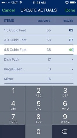 When you access one of the categories that allow you to enter actuals, you are presented with an Update Actuals option. Tap this option and select a row to enter the actual quantity. Enter the value and tap elsewhere on the screen to close the entry form.
