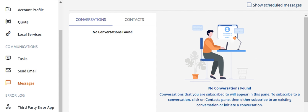 At the very beginning of an order or lead, the “No Conversation Found” screen may appear. Note that there are two tabs: Conversations and Contacts. “No Conversation Found” means that there isn’t conversation yet started under the Conversations tab. There will, however, be Contact(s) in the “Contacts” tab if a phone number was entered for the shipper or if Coordinators have been assigned to the order. Regardless, you can add a Custom Contact within the Contacts tab, as well. For any of these scenarios, either initiate conversation(s) using MSWeb Initiate Conversation, or use MSWeb Subscribe to Conversation when a Contact has already started a conversation and you would like to get those messages.