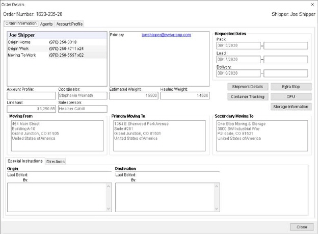 The Order Details screen is modeless and remains open while you work in MoversSuite.