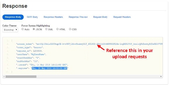 The RESTful service request returns an access_token. Use the value returned through the access_token on your upload requests. The following is an example response for an access token (JSON format): { "access_token": "mz4CQ1ZHeLocZ2OUtqp0b-kv...", "token_type": "bearer",, "expires_in": 1209599, "userName": "MyUserName", "startWorkHrs": "5", "endWorkHrs": "19",, ".issued": "Thu, 14 May 2015 16:11:59 GMT", ".expires": "Thu, 28 May 2015 16:11:59 GMT" }