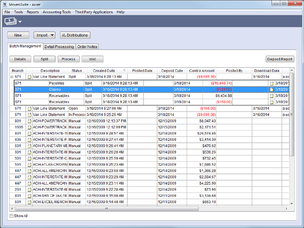 Payment Management is a batch processing tool used to apply and adjust payments and charges created through batches entered manually through the Cash Receipts module, through imported statements from a van line, or from a generic CSV file.