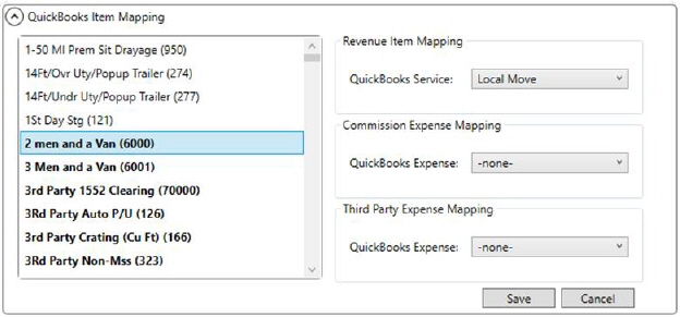 Highlight the Item Codes on the left and assign them to appropriate categories on the right. In the above example (Figure 9), the Item Code of 6000 is mapped to a Local Move category for revenue generation in QuickBooks.