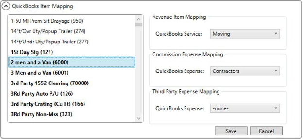 MoversSuite Administration > QuickBooks > QuickBooks Item Mapping
