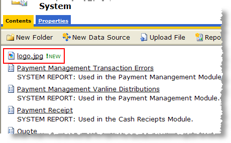 The image file will be visible within the System folder and will be available to be referenced by documents rendered through Microsoft SQL Server Reporting Services.