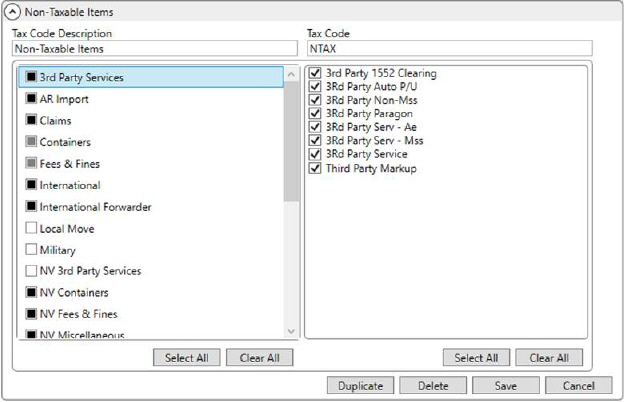 MoversSuite Administration > Accounting and Financial Services > Avalara Tax Codes