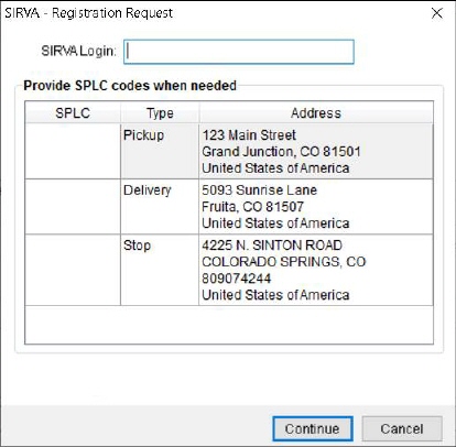 The SIRVA – Registration Request screen prompts users for a login ID for SIRVA STS as well as SPLC values for each location associated to the MoversSuite lead that was open when a user performed a SIRVA Registration Upload.