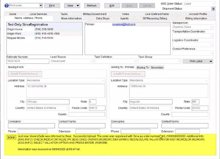 The request will generate a file in the backend and transmit it to SIRVA. At the bottom of the Name, Address, Phone tab, the application will keep you updated with the status of the upload.