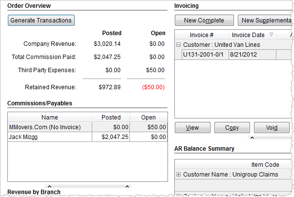 This section lists the commissions paid to employees along with posted and open amount of commissions. It also lists any Third Party Payables by vendor and includes the posted and open amount of the payable along with the invoice number adjacent to the vendor name; the application will display “No Invoice” when no invoice exists for the payable. |