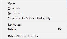 This function purges all errors other than the order that is open. The functionality duplicates that of the “Show Errors for Order XXX-XXX Only” checkbox present at the bottom of the screen. |