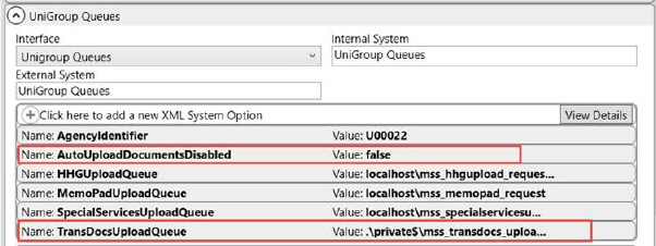 Use this setup to define the system options for the TransDoc processes under the “UniGroup Queues” system. Locate the XML System Setup record for the UniGroup Interface and