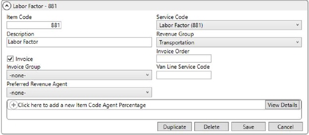 When this type is encountered, MoversSuite checks for an alternate Item Code record based on the same Service Code as the original Item Code. If one exists and the Van Line Service Code is also set to 999, then application references the alternate Item Code when items import; this alternate Item Code also available within the Transactions grid.