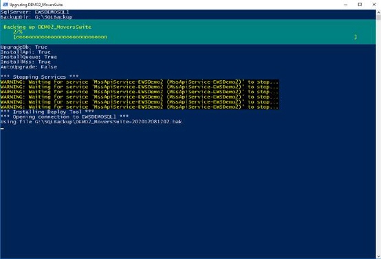 The Upgrade Tool streamlines all the functions of the deploy process into a simple dialog with a few prompts and performs all necessary tasks including requirements check, database backup, and the installation of the MoversSuite application and related products.
