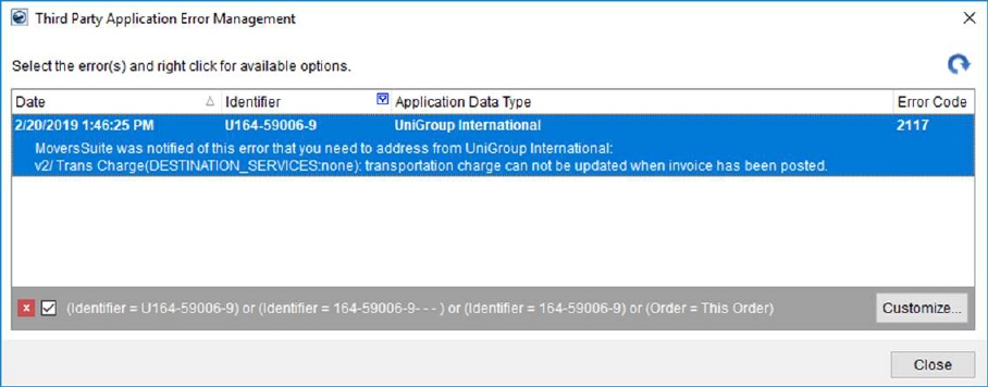 However, if you wish to edit a Sales Quote that is linked to UniGroup and was created and previously uploaded to UniGroup with a MoversSuite version prior to MoversSuite 2019 R05, then you need to first request a download of that UniGroup order before you will be permitted to upload any changes to your quote. In such cases, error 2140 is reported in the Third Party Application Error Management log. Once you request the download, MoversSuite will capture the UniGroup assigned charge identifiers when that download comes in. You should then review the quote, make any changes and then upload the quote. In most cases, this specific order should work fine thereafter. Once you have processed all open orders that started before you installed MoversSuite 2019 R05, this issue will go away.
