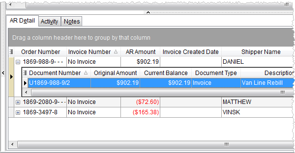 The AR Detail tab provides a user all details for open AR. This is the same data that appears in the AR section of the Dynamics GP Order Inquiry. Right-click options include the ability to view and email invoices and export grid data.