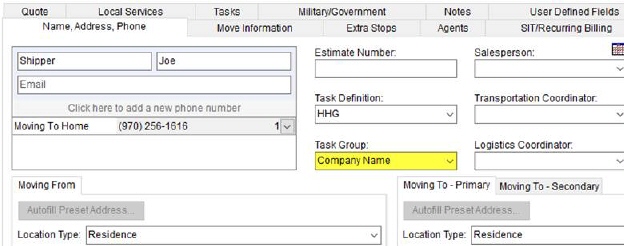 Users can select orders based on task definitions for a specific company name. Systems with defined task groups for specific companies allow you to set the company name, often referred to as “store rollouts,” as a Task Group for the order (Name, Address, Phone tab). This setting is then allows you to filter search results by the company name using the Select a Task Group field in a Find.