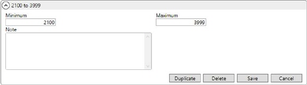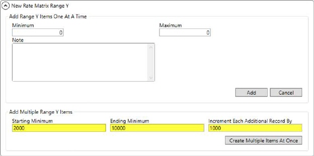 When adding records, the application allows for gaps, but produces an error when there are overlapping ranges. To assist you in creating ranges, the application allows you to create multiple items at once by specifying a starting and ending value along with the size (increment) of each tier. In the example below (Figure 35), ranges will be created from 2000 to 9999 in groups of 1000 (i.e. 2000-2999, 3000-3099, 4000-4099, et al.)