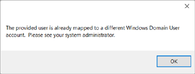 There can be only one user record associated to a Windows domain user. So, if your Windows domain or user name changes and you attempt to login, you will receive an error indicating that your user record is already mapped to a different Windows domain user.