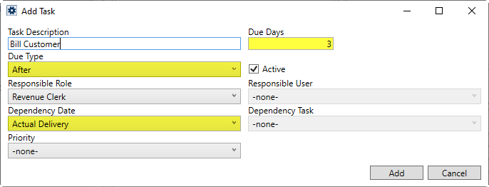 The Due Days and Due Type settings work in conjunction with the Dependency Date selection to determine the date the task is due. In the example below, the “Bill Customer” task will have a due date assigned to that is three days after the Actual Delivery date is set on the order. The application automatically sets the task due date when the Actual Delivery date.
