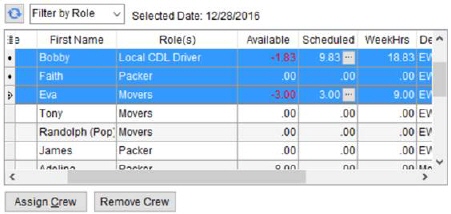 Note: It is possible to assign work beyond the hours available and beyond the 24-hour work period for contractor work, etc. When workers are assigned beyond their availability, the crew data grid will show this overage as a negative value (in red font).