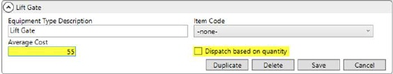 If the Dispatch based on quantity flag is set, then costing amounts compute based on quantity. Otherwise, if this flag is not checked, then costing is based on an hourly rate. In the example above (Figure 13), a three-hour service for the Lift Gate would cost the company $165.