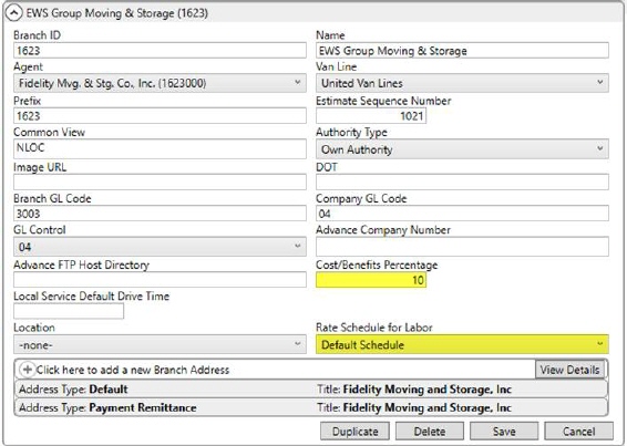 Assign a Rate Schedule for Labor to be in effect for specific branches. This setting determines which wage amount to apply to cost and rated amounts within Job Costing. Refer to Step 4 for more information.