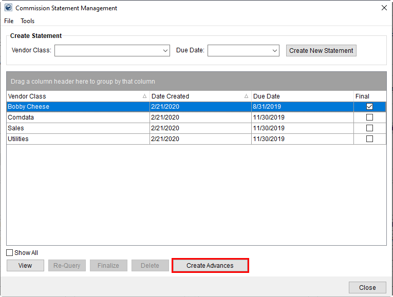 TECHNICAL NOTE: Advances created through this process are stored within the AdvanceFromCommission table. This table links back to the CommStmtVendor table for the vendor record being advanced from.