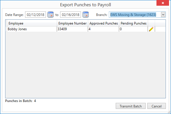 MoversSuite integrates with external providers to furnish punch activities from MSCrew for payroll processing. The option to export the punch activity is available through the Export Punches to Payroll screen.
