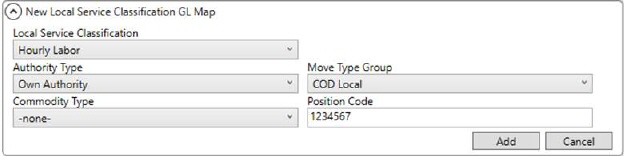 For each defined Classification, you can create any number of mapping records within the Local Service Classification GL Map Setup. These records identify the Position Code for the Classification based on any combination of Authority Type, Move Type Group, and/or Commodity Type (Commodity Setup) set on the order.