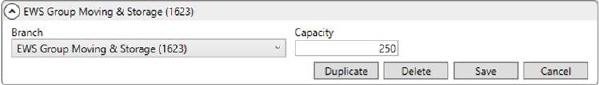 For each branch you want included in Capacity Planning, set the Branch from the list of available branches defined within Branch Setup and set the Capacity to the maximum packing count available.