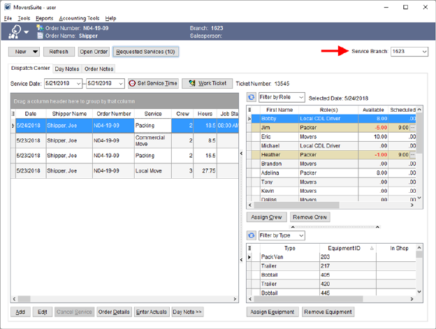 While working in Local Dispatch, you can see a list of common branches through the Day Notes tab. The Branch selector on this screen displays all common branches associated to the Service Branch. In the illustration below (Figure 31), branches 1623, 203, 503, and 603 are all part of the same common view.