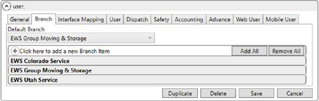 One restriction to the list of services, crew, and resources that you can access is branch assignment through your Personnel Setup record. You can only access data for branches that you are assigned. In the example below (Figure 28), this person can access the three EWS branches. If the common view also includes a fourth branch and you wish this employee to service this branch as well, then you would need to add that fourth branch within the Branch tab of their Personnel Setup record.