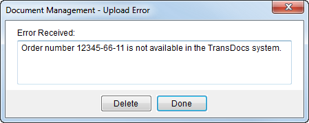 The Document Management Upload Error dialog appears when a user double-clicks on the error icon within Document Management.  It provides a user with the full text description of the error along with the ability to select the message to copy and paste the selection into another application.