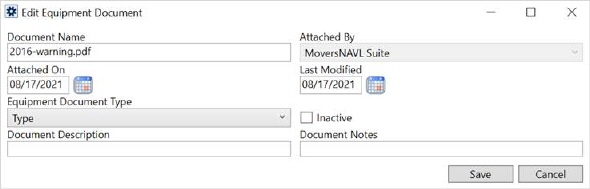Administrators have the option to update the properties associated to a document. To edit document properties, go to Administration > Operations > Equipment > choose record > Documents tab and click on a document. This opens the Edit Equipment Document dialog allowing you to modify the Equipment Document Type, Document Description, or Document Notes.