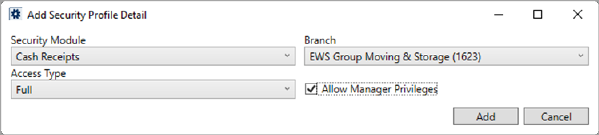 Since Electronic Payments generate Cash Receipts batches and utilize other Cash Receipts functions, each person you wish to process payments must have Full access to the Cash Receipts module for each supported branch. Additionally, set the Allow Manager Privileges flag to allow employees to refund and void Electronic Payments.