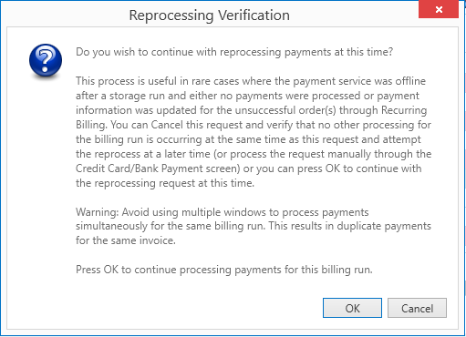If you encounter a Reprocessing Verification confirmation warning, please be cognizant of what you are confirming. This warning may appear when utilizing the Reprocess All Unsuccessful Payments option from within the right-click menu in Recurring Payment Processing and the payment service was offline after 4a storage run and either no payments were processed or payment information was updated through Payment Setup on unsuccessful order or orders. This warning is requesting that you verify that no other payment processing is occurring for the exact same billing run.