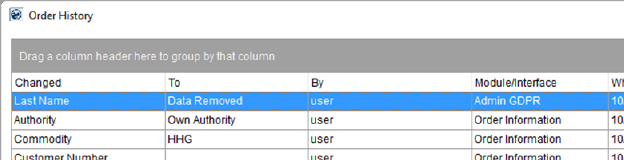 The Order History also records the redaction in order data. Fields currently recorded within Order History are updated to reflect the removal. This provides a means of identifying when and by whom the data was removed. In the example below (Figure 126), the highlighted record indicates that the Last Name field shows being changed to “Data Removed” by the user named “user” through the “Admin GDPR” function.