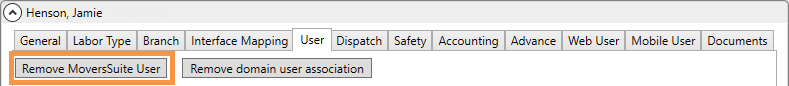 5. From the User tab, click "Remove MoversSuite User" to free-up the license for future users.