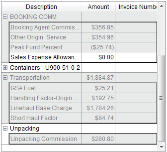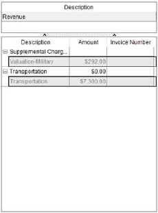 This section lists the items that can display on the invoice based on what is generated through Quotes, Rating Sends, Revenue (example below), and TechMate Imports. Additionally, when invoicing through Claims, additional sources of Receivables and Handling Revenue are also available.