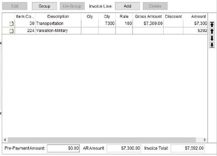 This section provides you with all the line items and groups that display on the invoice. Use the up and down arrows to move items or groups up or down in the list. Add revenue items and groups using the buttons above the grid and view totals for the line items below.