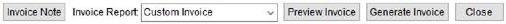 Use this section to create an invoice note that displays on the output report, select a report from those defined within Report Setup, and view and generate the invoice. You can choose between SF1113 Laser, Custom Invoice, and Revenue Invoice etc.